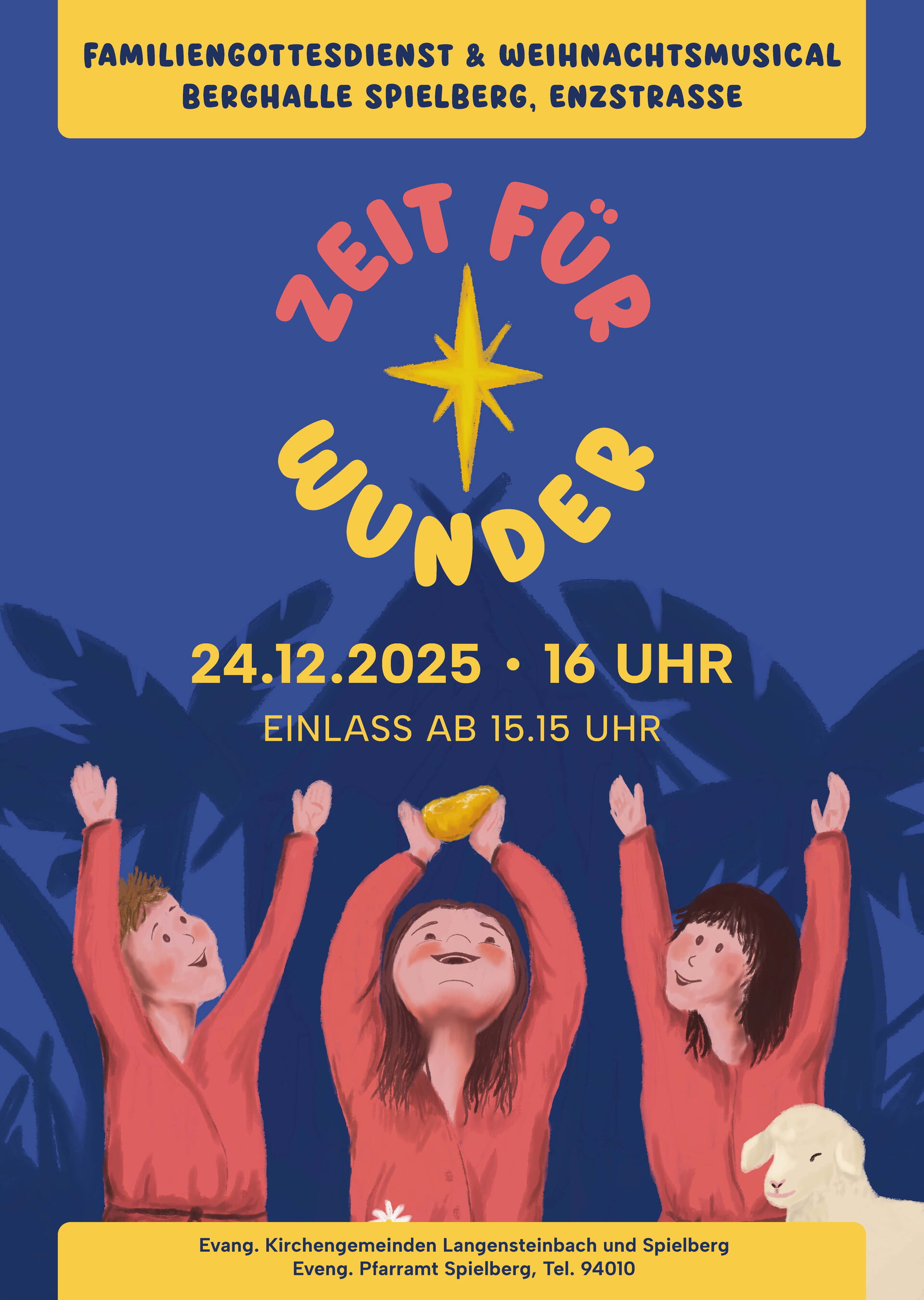 Am Heiligabend 2025 gibt es ein besonderes Angebot für Familien: Ein Weihnachtsgottesdienst mit Weihnachtsmusical! Die Kirchengemeinden Langensteinbach und Spielberg habe alle Kräfte zusammengelegt, um dieses große Projekt zu stemmen: über 100 Menschen arbeiten seit vielen Wochen intensiv daran, am Heiligabend das Musical „Zeit für Wunder“ auf die Bühne zu bringen. Es erwarten Euch eine bewegende Geschichte, Tanz, Theater und Musik mit Ohrwurm-Garantie! Wir laden alle Familien herzlich ein, sich mit uns am Heiligabend 2025 von der Weihnachtsbotschaft berühren zu lassen, denn es ist: Zeit für Wunder! Die Berghalle in Spielberg steht bereit für Euch am 24.12.2025 ab 15:15 Uhr und es wird auch einen Livestream geben. Verfolgt die Entstehung des Musicals auf Instagram (ek_spielberg) und findet alle Infos auf den Websiten der Kirchengemeinden Langensteinbach und Spielberg.
