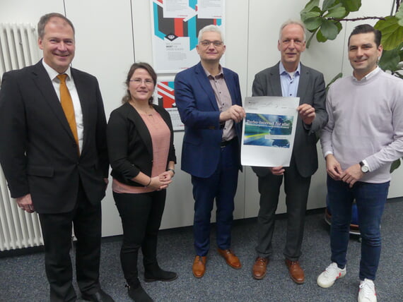 Symbolischer Startschuss Glasfaserverbindung: Jürgen Roth, Werkleiter „Dätwyler“, Katharina Manthey, Innenministerium, Ragnar Watteroth, BLK-Geschäftsführer, Jens Timm, Bürgermeister und Nicolas Zippelius, MdB. (von links).