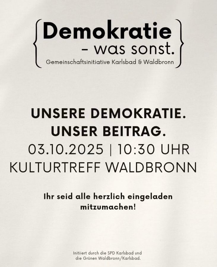Wir alle wissen, dass unsere Demokratie immer stärker unter Druck gerät. Wenn Dir unsere Demokratie wichtig ist, wenn Du mit anderen darüber ins Gespräch kommen willst, dann bist Du herzlich eingeladen am 3.10. um 10.30 Uhr ins Kulturtreff nach Waldbronn zu kommen. Wir betrachten diese Initiative als einen offenen Raum, der vom Mitmachen lebt. Egal ob Du dich bisher schon politisch oder gesellschaftlich engagiert hast oder nicht - Deine Stimme zählt und Dein Beitrag ist willkommen.