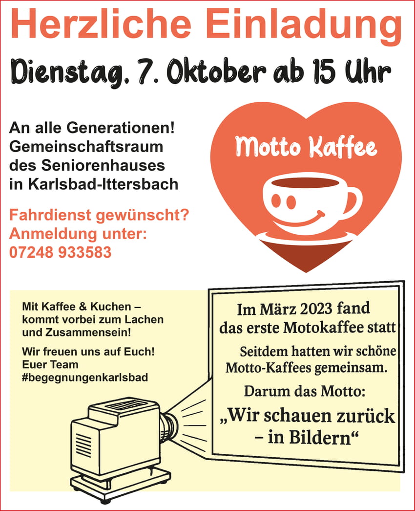 Mit dem Motto Kaffee laden wir euch - alle Generationen - jeden ersten Dienstag im Monat zu einem gemütlichen Beisammensein im Gemeinschaftsraum des Seniorenhauses in Karlsbad-Ittersbach ein.