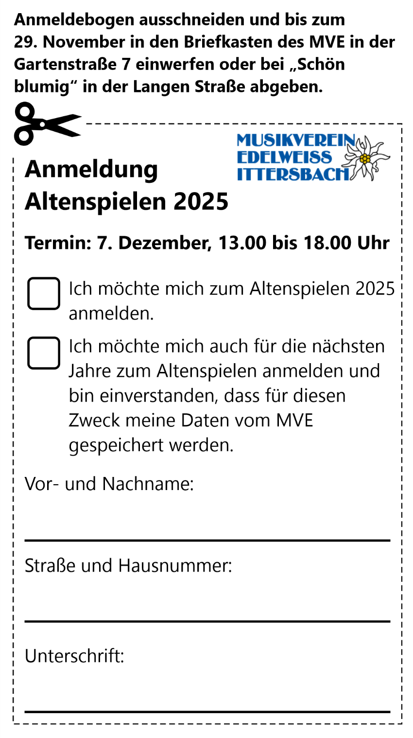 Das Altenspielen hat beim Musikverein Edelweiß Ittersbach schon eine lange Tradition. An diesem vorweihnachtlichen Sonntag spielt der Musikverein den über 80-jährigen Mitbürgerinnen und Mitbürgern ein Weihnachtsständchen vor der Haustür. Dieses Jahr findet unser Altenspielen am 7. Dezember statt.