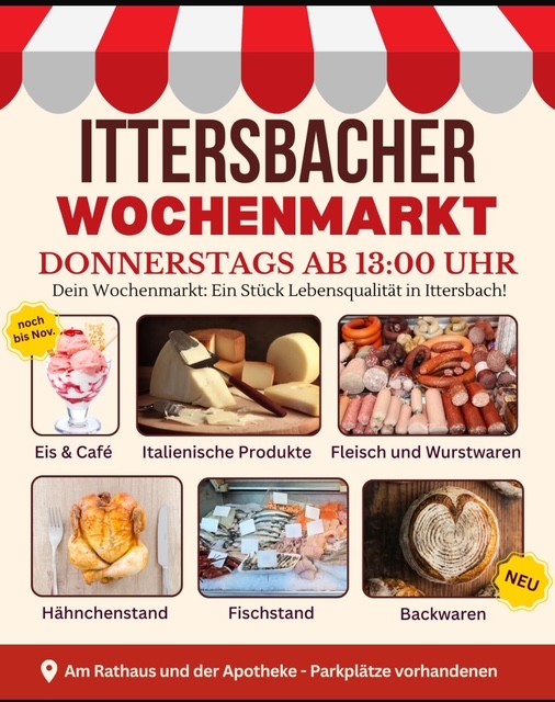 jeden Donnerstagmittag (außer an Feiertagen) findet vor der Apotheke und auf dem Rathausplatz in Ittersbach der Wochenmarkt statt. Verschiedene Stände bieten eine Auswahl an Speisen und frischen Produkten an. Durch euren Besuch unterstützt ihr die lokale Wirtschaft und tragt dazu bei, das Dorfleben zu beleben.