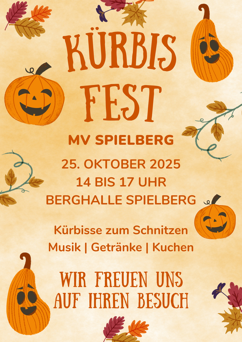 Auch in diesem Jahr werden wir wieder unser allseits beliebtes Kürbisfest veranstalten. Am 25. Oktober sind alle jungen Künstler sowie deren Eltern und Großeltern ab 14 Uhr in die Spielberger Berghalle eingeladen, um gemeinsam Kürbisse zu schnitzen und die Herbst- und Halloweenzeit einzuläuten. Die Kürbisse stellt der Musikverein, Schnitzmesser müssen selbst mitgebracht werden. Für Essen, Getränke, Kaffee und Kuchen ist – ebenso wie für Musik – selbstverständlich gesorgt. Wir freuen uns auf Ihren Besuch und einen gemütlichen Kinder- und Familiennachmittag.