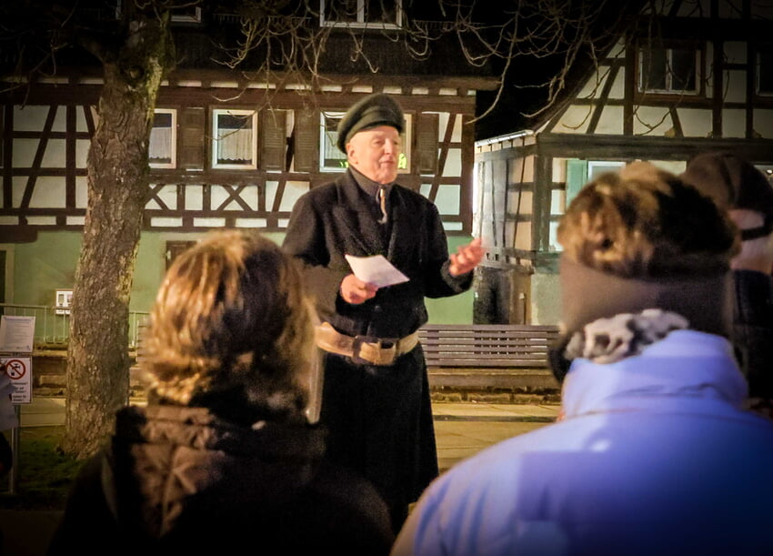 Norbert Ried ist in der Tat ein Enkel des letzten Dorfschützen in Langensteinbach und kennt die Geschichte und die Geschichten unserer Gemeinde in allen Details. Mit historischen Schilderungen und unterhaltenden Anekdoten führt er uns zu Häusern, durch Gassen, auf Hinterhöfe, wo sich so manch Erstaunliches zugetragen hat. Die Führung wird informativ und amüsant zugleich.