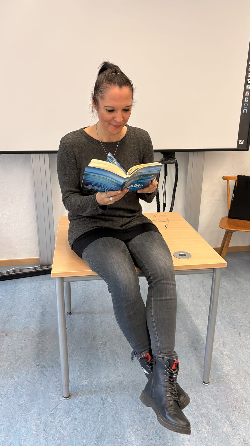 Anschließend las Sue Glanzner aus ihrem Buch Shaiko, in dem die Geschwister Shana und Koan bei einem Schnorchelausflug einem Hai begegnen und mit ihm Freundschaft schließen. Doch nicht alle Menschen verstehen diese Verbindung. Als ein Unfall geschieht, droht dem Hai große Gefahr. Die Kinder müssen beweisen, dass Shaiko unschuldig ist und zeigen, wie wichtig es ist, Tiere zu schützen und gerecht zu behandeln. Die Geschichte verbindet Abenteuer mit echtem Wissen über Haie.