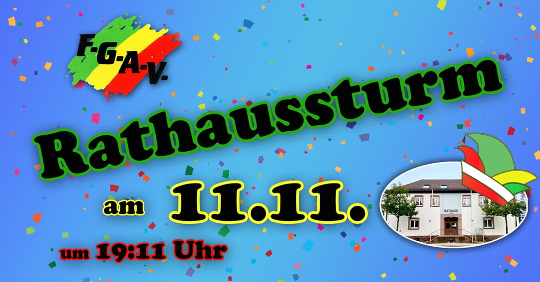 Liebe Freunde der Auerbacher Fasnacht, am 11.11. starten wir in die neue Kampagne mit dem Sturm auf das Auerbacher Rathaus. Bürgermeister Björn Kornmüller und Ortsvorsteher Steffen Langendörfer werden in Gewahrsam genommen und FGAV-Präsident Christian Zechiel übernimmt bis Aschermittwoch den Rathausschlüssel. Während der offiziellen Zeremonie, bei der auch das Motto für die kommende Kampagne bekannt gegeben wird, zeigen die Mädels der FGAV-Sternengarde ihr Können. Damit niemand friert gibt es gratis Glühwein. Im Anschluss wird in der Talblickhalle weitergefeiert - der Eintritt ist frei! Merkt euch den Termin vor und kommt vorbeit - wir freuen uns darauf mit allen Fans und Freunden der FGAV in die 5. Jahreszeit zu starten. Weitere Informationen stehen auf unserer Homepage www.fgav.de sowie auf Facebook und Instagram bereit.