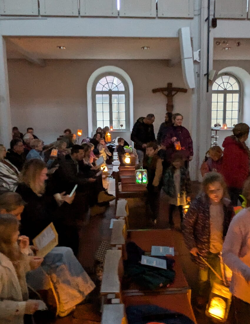 Kurz vor 16 Uhr luden die Kirchenglocken ein und jedes Kind trug stolz seine Laterne zunächst an den Platz. Nach der Begrüßung und dem ersten Lied „Durch die Straßen auf und nieder“ folgte fast schon traditionell die Martinsgeschichte, dargestellt von einigen Erzieherinnen. Dieses Jahr sollte es eine Mitmachgeschichte sein, erlebbar mit allen Sinnen und hautnah dabei. Jede Bewegung der Darsteller wurde von den Familien lautmalerisch und mit Geräuschen unterstützt. Der Schauplatz des Spiels war im gesamten unteren Bereich der Kirche, inmitten der vielen Familien. Begleitet von einigen Kindern ging der Bettler von Haus zu Haus, klopfte hier und dort, auch die Kinder klopften an und wurden wiederholt weggeschickt. Wieder am Altar angekommen, der Bettler ließ sich nieder, kam St. Martin mit seinem Pferd nach vorne geritten. Auch an seiner Seite waren einige Kinder. Sie erlebten nun direkt die Freundlichkeit, Großzügigkeit Martins und Teilung des Mantels mit. Dann wollten auch wir das Teilen erleben, und zwar taten wir das mit den Hefeteilchen, die am Vormittag in der Kita gebacken wurden. Natürlich durfte danach das Laufen mit den Laternen nicht fehlen. Die Lichter in der Kirche gingen aus und zu „Komm, wir woll`n Laterne laufen“ liefen die Kinder und ErzieherInnen einige Runden, eine heimelige und festliche Atmosphäre entstand. Nach dem Gottesdienst zogen wir mit den Familien auf die Gemeindewiese, um das Laternenlaufen nochmal so richtig zu erleben und noch zwei Lieder zu singen. Damit ging eine gelungene und feierliche Stunde zu Ende. Einen großen Dank geht an den Posaunenchor, der sehr zahlreich erschien, und das um die Uhrzeit. Danke auch an die Eltern, die uns am Vormittag mit Teigspenden und dem Backen der Hefeteilchen unterstützt hatten.