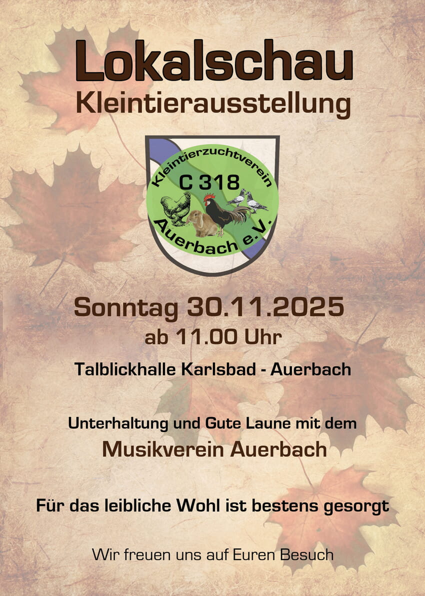 Wir laden Sie herzlich zu unserer diesjährigen Lokalschau am 30.11.2025 in der Talblickhalle in Auerbach ein.