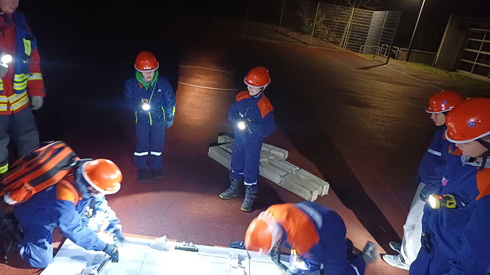 Zunächst trainierten die Jugendlichen die Ausleuchtung einer Einsatzstelle, um auch bei schlechten Sichtverhältnissen sicher arbeiten zu können. Anschließend galt es, drei versteckte Übungspuppen aufzufinden und nach Feuerwehrstandard mittels Rettungsbrett und Trage zu retten.