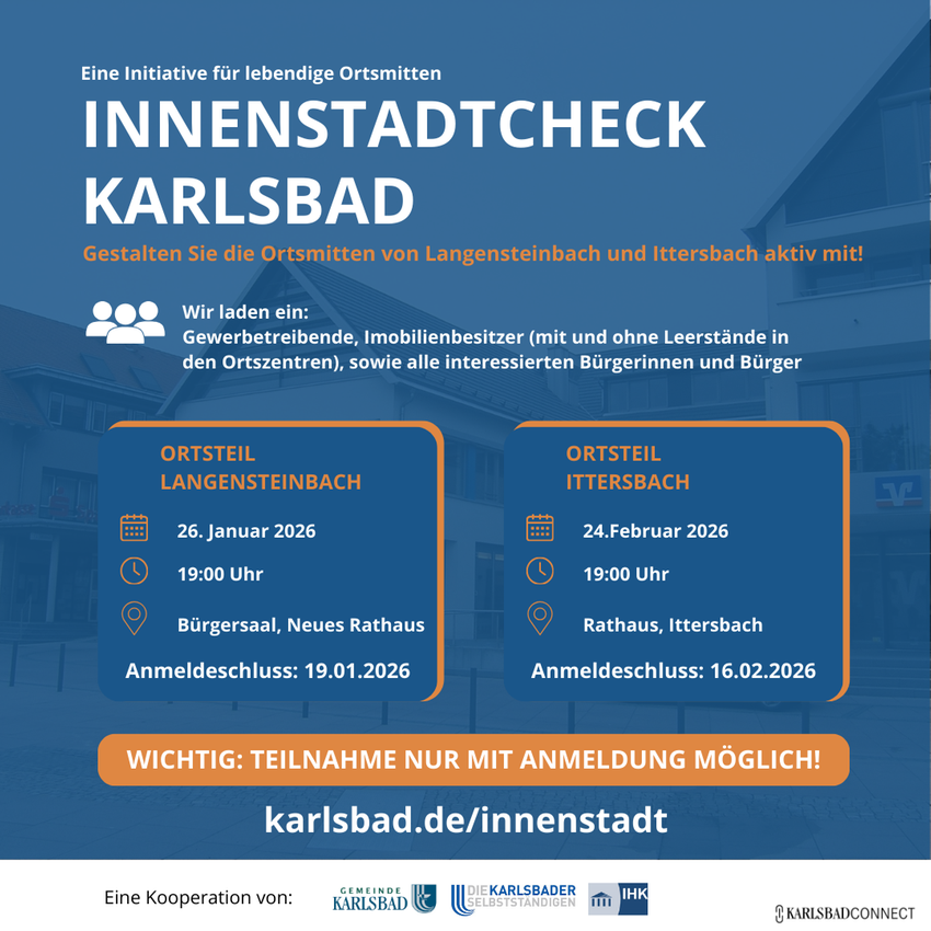 Gemeinsam mit der IHK Karlsruhe und den Karlsbader Selbstständigen e.V. (DKS) laden wir Sie herzlich dazu ein, aktiv an der Analyse und Zukunftsplanung teilzunehmen!