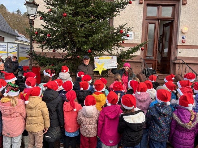 Wie in den vergangenen Jahren auch präsentierten sich die Schülerinnen und Schüler der Mutschelbacher Grundschule beim dorfeigenen Nikolausmarkt als Chor. Mit den Liedern „Advent ist ein Leuchten“ und „He, Frau Holle“ stimmten sie fröhlich in die bevorstehende Adventszeit ein und sorgten am Ende der Vorführung nicht nur beim Publikum durch Ihren Gesang für ein Leuchten. Stolze 2.684,71€ wurden beim Martinslauf von den Kindern gesammelt und von den großzügigen Sponsoren gespendet, was zu großem Beifall in der Dorfmitte sorgte. Auch die ehemaligen 4. Klässler spendeten ihr Preisgeld vom Korksammelwettbewerb im letzten Schuljahr. Der Scheck wurde anschließend durch die kommissarische Schulleitung Frau Büchele direkt an den Kinderhospizdienst weitergegeben, welche berichteten, wofür sie dieses Geld einsetzen werden.