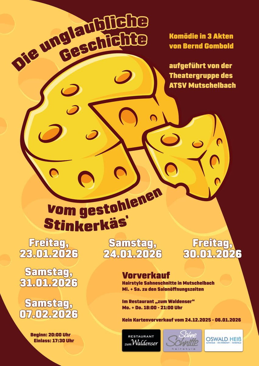 Es sind keine Platzreservierungen möglich! Ab sofort können an folgenden Vorverkaufstellen und zu folgenden Zeiten die Karten erworben werden: Jeden Montag & Donnerstag von 18.00-21.00 Uhr im Restaurant „zum Waldenser“ und jeden Mittwoch & Samstag zu den Salonöffnungszeiten im „Hairstyle SahneSchnitte“ in Mutschelbach. Bitte beachten: Kein Vorverkauf vom Mi. 24.12.2025 bis Di. 06.01.2026. Für die Premieren-Aufführung bei der Winterfeier des ATSV Mutschelbach am Samstag, 17.01.2026 sind gesondert Karten über den ATSV Mutschelbach erhältlich, Informationen folgen. Alle Karlsbader Seniorinnen und Senioren erinnern wir gerne an unseren traditionellen Seniorennachmittag am Sonntag, 18.01.2026. Wir freuen uns auf Euch!