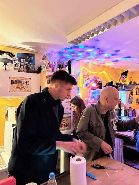 Während des Abends übernimmt Veronika häufig den Thekenbereich und sorgt dafür, dass Bestellungen zügig ankommen. Wer malen, bauen oder sich künstlerisch austoben möchte, findet in ihr eine geduldige und hilfsbereite Ansprechpartnerin.