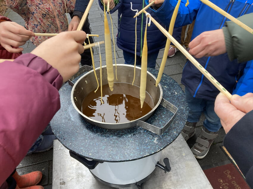 Traditionell markiert das Kerzenziehen den Jahresabschluss unserer Vereinsarbeit. Auch wenn die Bienen nun Winterruhe halten, bleibt die Arbeit der Imker nicht stehen. In den kommenden Wochen stehen vor allem Wartungsarbeiten an den Beuten sowie die Vorbereitung auf die nächste Saison an. Gleichzeitig bieten die Wintermonate Raum für Austausch, Geselligkeit und neue Ideen für das kommende Jahr, bevor es dann im Frühling mit steigenden Temperaturen wieder mit frischem Schwung an die Arbeit mit unseren Bienen geht.