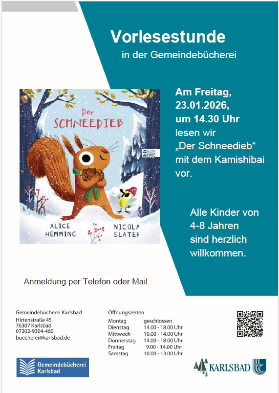 Am Freitag, 23.01.2026 findet unsere erste Vorlesestunde im neuen Jahr statt. Gelesen wird "Der Schneedieb" von Alice Hemming und Nicola Slater. Wie immer gibt es einen kreativen Ausklang. Details siehe Plakat.