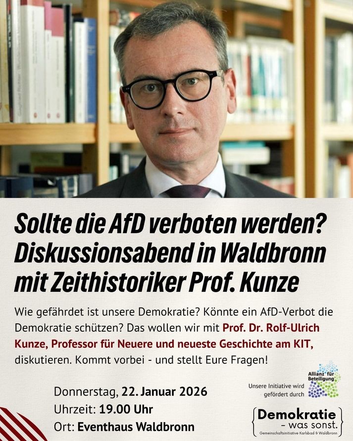 offener Diskussion ins Eventhaus Waldbronn ein. Im Mittelpunkt des Abends steht die Frage, wie wehrhaft unsere Demokratie heute ist – und ob ein AfD-Verbotsverfahren eine geeignete Möglichkeit ist, um die Demokratie zu schützen. Als Referent spricht der Karlsruher Zeithistoriker Prof. Dr. Rolf-Ulrich Kunze, der Neuere und neueste Geschichte an der Fakultät für Geistes- und Sozialwissenschaften des KIT Karlsruhe lehrt.