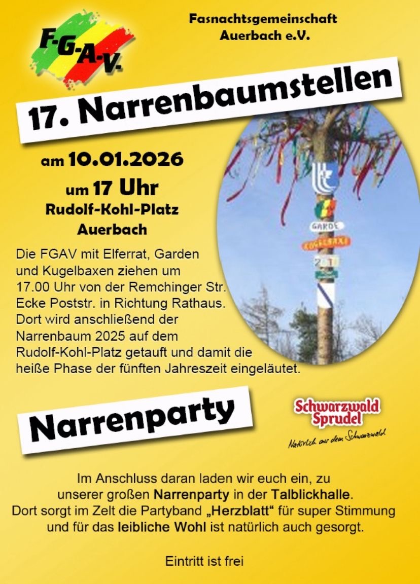Am 10.01.2026 ziehen der FGAV-Elferrat, Tanzgarden und Kugelbaxen um 17 Uhr über die Remchinger Str. Richtung Rathaus. Dort taufen wir den Narrenbaum 2026 auf dem Rudolf-Kohl-Platz und leiten damit die heiße Phase der Kampagne ein.