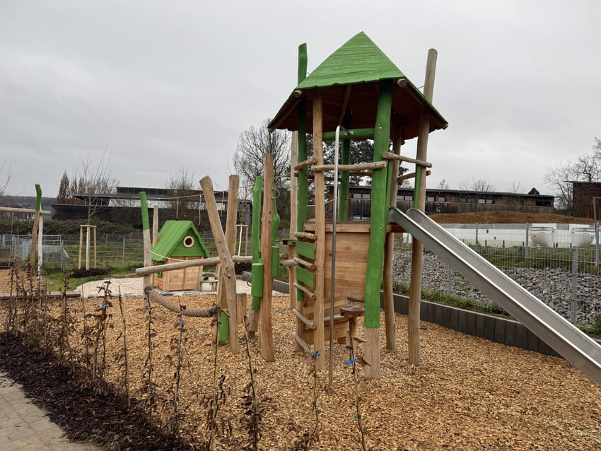Einzigartig und zugleich einladend präsentiert sich der neue Spielplatz im Baugebiet “Schaftrieb“ in Karlsbad-Langensteinbach. Bürgermeister Björn Kornmüller, der Leiter des Amtes für Bau, Planung und Umwelt Joachim Guthmann sowie Wolfgang Jannarelli vom Ingenieurbüro Kirn machten sich vor Kurzem selbst ein Bild von der neuen Anlage. Für rund 80.000 Euro entstand eine vielseitige Spielkombination, ein Spielhaus sowie eine Einfachschaukel. Der Spielplatz richtet sich an Kinder im Alter von 3 bis 14 Jahren und bietet ihnen zahlreiche Möglichkeiten zum Spielen, Klettern und Entdecken. Der Standort in der Nähe eines Fuß- und Radweges ist ideal gewählt. Umgeben von neu gepflanzten Bäumen fügt sich der Spielplatz harmonisch in die natürliche Umgebung ein. Auf zwei Spieleebenen können die Kinder ihrem Bewegungsdrang freien Lauf lassen. Die individuell gestalteten Spielgeräte sind bewusst keine Standardlösung. Sie laden zum kreativen Spielen ein.
