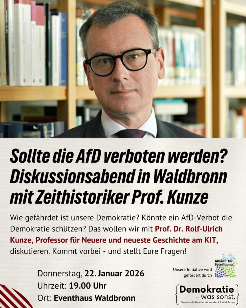 offener Diskussion ins Eventhaus Waldbronn ein. Im Mittelpunkt des Abends steht die Frage, wie wehrhaft unsere Demokratie heute ist – und ob ein AfD-Verbotsverfahren eine geeignete Möglichkeit ist, um die Demokratie zu schützen. Als Referent spricht der Karlsruher Zeithistoriker Prof. Dr. Rolf-Ulrich Kunze, der Neuere und neueste Geschichte an der Fakultät für Geistes- und Sozialwissenschaften des KIT Karlsruhe lehrt.