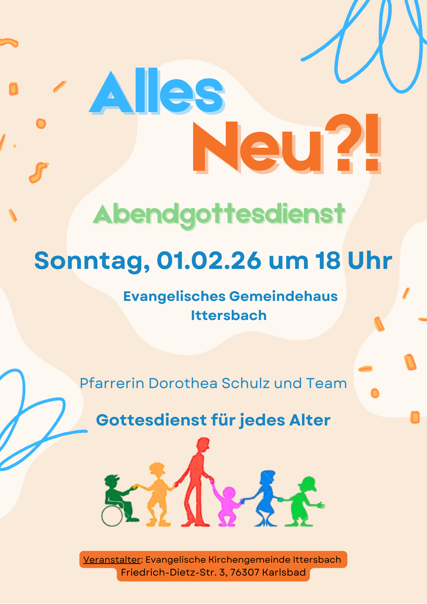 Am Sonntag, 1. Februar 2026 feiern wir den Gottesdienst am Abend um 18:00 Uhr im Gemeindehaus als Gottesdienst für jedes Alter. Das Thema lautet: „Alles neu!?“ und wird von einem Team rund um Pfarrerin Dorothea Schulz vorbereitet. Im Anschluss gibt es die Möglichkeit, bei Snacks und Getränken noch im Gespräch zu verweilen.
