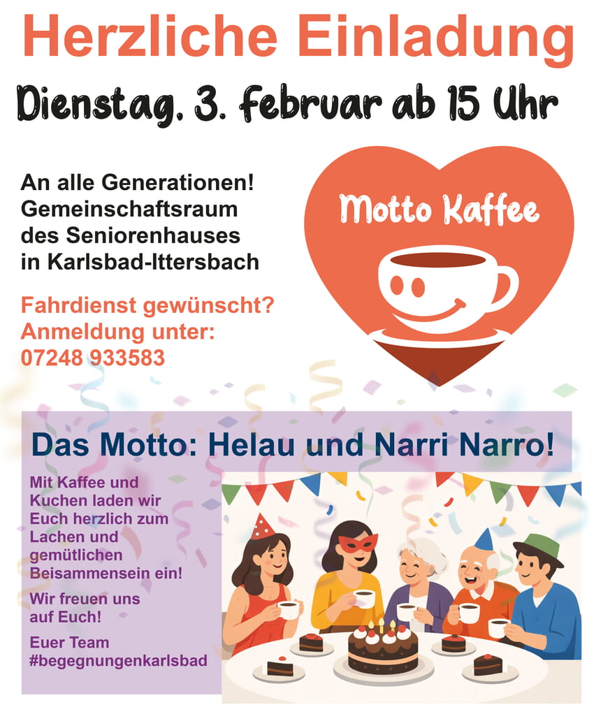 Mit dem Motto Kaffee laden wir euch - alle Generationen - jeden ersten Dienstag im Monat zu einem gemütlichen Beisammensein im Gemeinschaftsraum des Seniorenhauses in Karlsbad-Ittersbach ein.