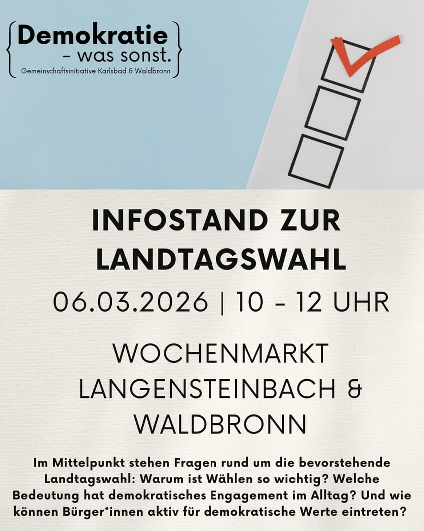 Wir informieren am 6. März von 10 bis 12 Uhr mit einem Infostand auf dem Wochenmarkt in Langensteinbach sowie zeitgleich auf dem Markt in Waldbronn über die Bedeutung demokratischer Beteiligung.