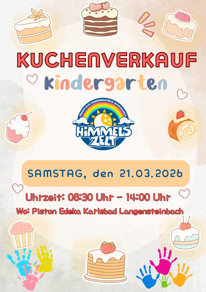 Die Eltern der Kindertagesstätte Mutschelbach laden herzlich zum Kuchenverkauf am 21.3.2026 vor dem Edeka in Langensteinbach ein!