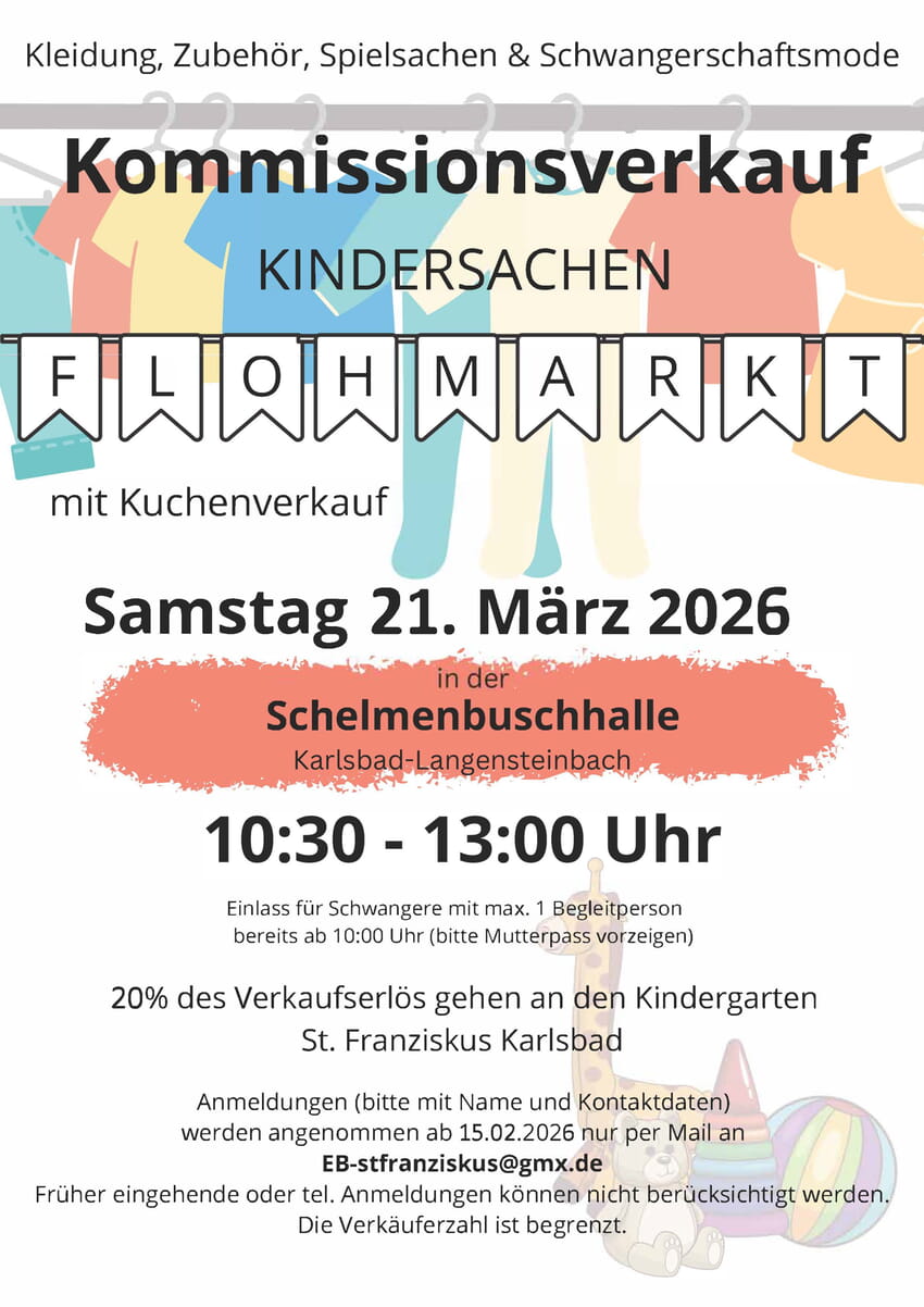 Herzliche Einladung zu unserem Flohmarkt am Samstag, den 21.03.2026 in der Schelmenbuschhalle in Langensteinbach. Wir freuen uns auf Ihr Kommen.