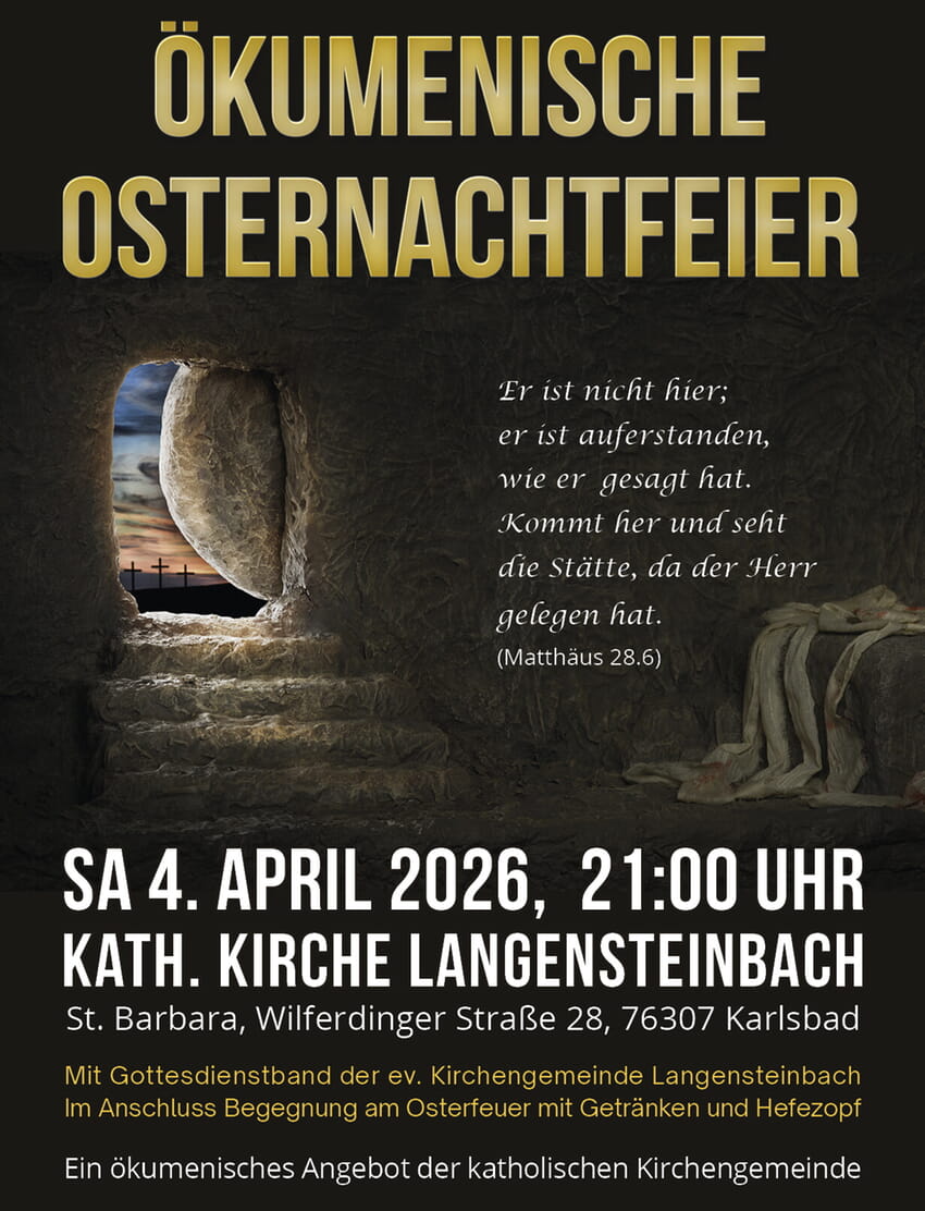 21:00 Langensteinbach Ökum. Feier der Osternacht mit Band der evang. Gemeinde u. anschließender Begegnung am Osterfeuer