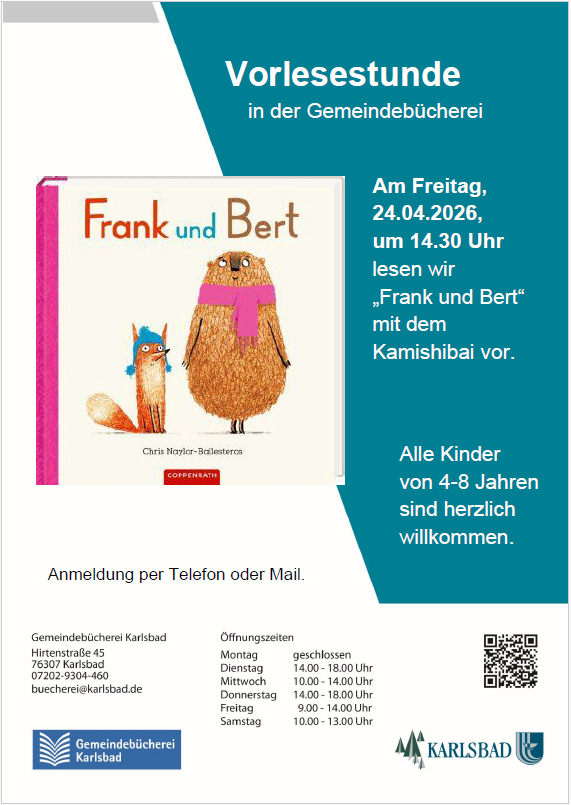 Unsere nächste Vorlesestunde findet am Freitag, 24.04. um 14.30 Uhr statt. Vorgelesen wird "Frank und Bert" von Chris Naylor-Ballesteros. Wie immer gibt es einen kreativen Ausklang. Willkommen sind alle Kinder von 4 - 8 Jahren.