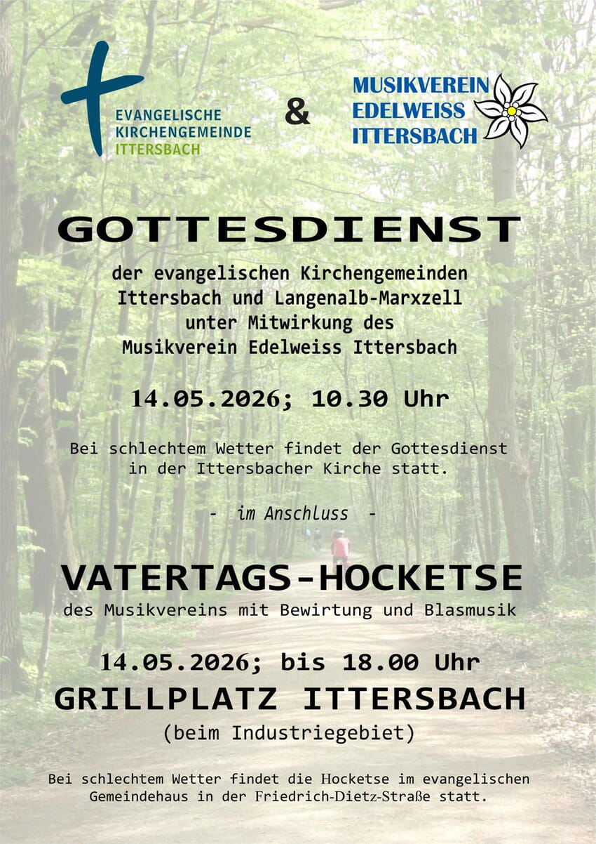 Am 14. Mai 2026 findet unsere traditionelle Vatertagshocketse auf dem Grillplatz im Industriegebiet Ittersbach statt. Um 10.30 Uhr beginnt der Gottsdienst im Freien, der von den evangelischen Kirchengemeinden Ittersbach und Langenalb-Marxzell gestaltet wird. Der Musikverein umrandet den Gottedienst musikalisch.