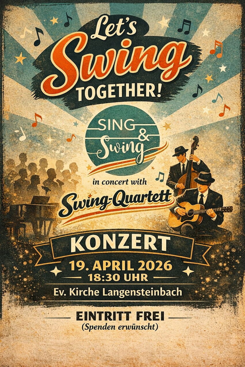 Einer der musikalischen Höhepunkte im Jahr ist das Frühjahrskonzert. In diesem Jahr hat sich der Chor Sing&Swing Gäste eingeladen. Gemeinsam mit dem Swing Quartett laden wir am 19. April 2026 um 18.30 Uhr in die evangelische Kirche Langensteinbach ein. Unter dem Motto „Let´s swing together“ werden die beiden Ittersbacher Formationen ein abwechslungsreiches musikalisches Programm anbieten. Es wird heiter und "beswingt", dynamische Rhythmen wechseln mit getragenen Passagen ab. Bekannte Evergreens werden ebenso zu hören sein, wie weniger bekannte jazzige Stücke.