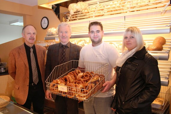 „Ich freue mich, die Karlsbader mit guten Backsachen versorgen zu können“ meinte Bäcker Jens Haffner beim Besuch von Bürgermeister Rudi Knodel und Elke Wildenmann von der Wirtschaftsförderung sowie Ortsvorsteher Reinhard Haas anlässlich der Besichtigung der Bäckerei Haffner in Spielberg am Dienstag, 28. Januar 2014. Jens Haffner hat in der zweiten Generation die Bäckerei Pagel übernommen. Die Bäckerei Haffner zeigt sich in neuen Farben und bietet ein kleines Stehcafe, welches bei einem Stück Kuchen oder Torte und einer Tasse Kaffee zum Verweilen einlädt. Die Backstube ist im Zuge der Übernahme ebenfalls neuwertig ausgestattet worden. „Wir legen Wert auf Qualität und Kundenfreundlichkeit“, erläuterte Haffner im Gespräch mit den Gemeindevertretern. Beispielsweise werden die Teige ausschließlich aus Vorteigen gemacht. Dieser natürliche Vorgang sichere die Qualität und sorge gleichzeitig für eine längere Frische der Backwaren. Das Mehl wird von der Rheintal Mühle bezogen. Neben Brot und Brötchen gibt es auch Dauergebäck, verschiedene Blechschnitten und süße Plunderstücke. Abgerundet wird das Angebot durch die „Neuen alten Spielberger Brezeln“ die nach altem, traditionellem Rezept und Backvorgang wieder hergestellt werden. „Die größte Backfreude habe ich an den „Neuen alten Brezeln““. Natürlich können auch gerne Torten und Partygebäck für verschiedene Anlässe bestellt werden. Wer Hunger auf Herzhaftes hat, findet an der Wursttheke mit Produkten der Metzgerei Messaros bestimmt das Richtige. Vier stets freundliche Verkäuferinnen gehören zum Fachpersonal.